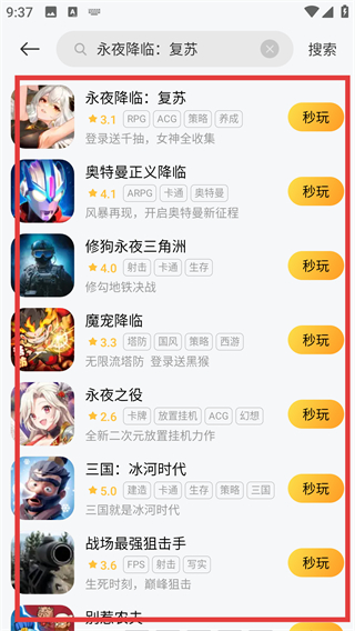 3、搜索结果页会展示相关游戏,比如【永夜降临:复苏】,点击对应游戏旁的【秒玩】就能直接体验啦。