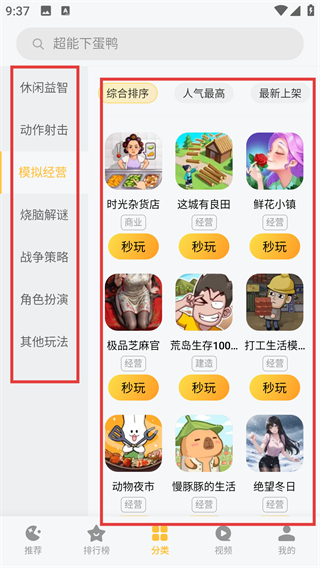 4、切换到【分类】页选择【模拟经营】类,就能看到该类别下的游戏列表,轻松找到想玩的经营类游戏哦。