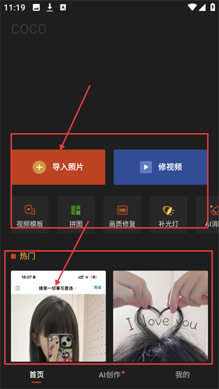 1、在APP首页,点击【导入照片】按钮,可选择目标图片素材,也能直接挑选热门模板里的示例图开启编辑啦。