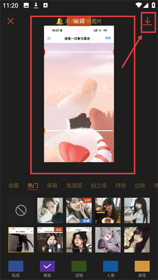 3、在编辑页面,可调整图片效果,完成后点击右上角的下载按钮,就能将编辑好的内容保存到设备啦。