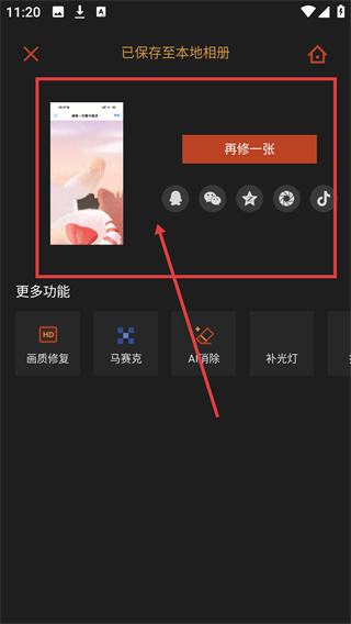 4、保存成功后,页面会提示【已保存至本地相册】,还能点击【再修一张】继续编辑新的图片素材呀。