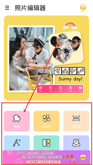 1、在照片编辑器首页点【拼图】选项,能进入拼图编辑界面,后续可把多张图片拼成创意版式啦。