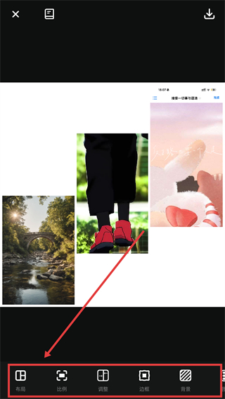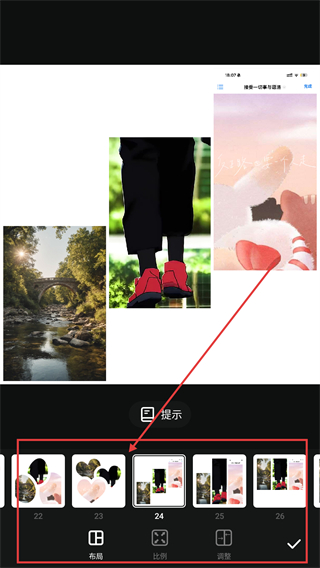 3、在布局面板选心仪的样式,像心形组合这类,就能让图片按对应版式排列,更有设计感啦。