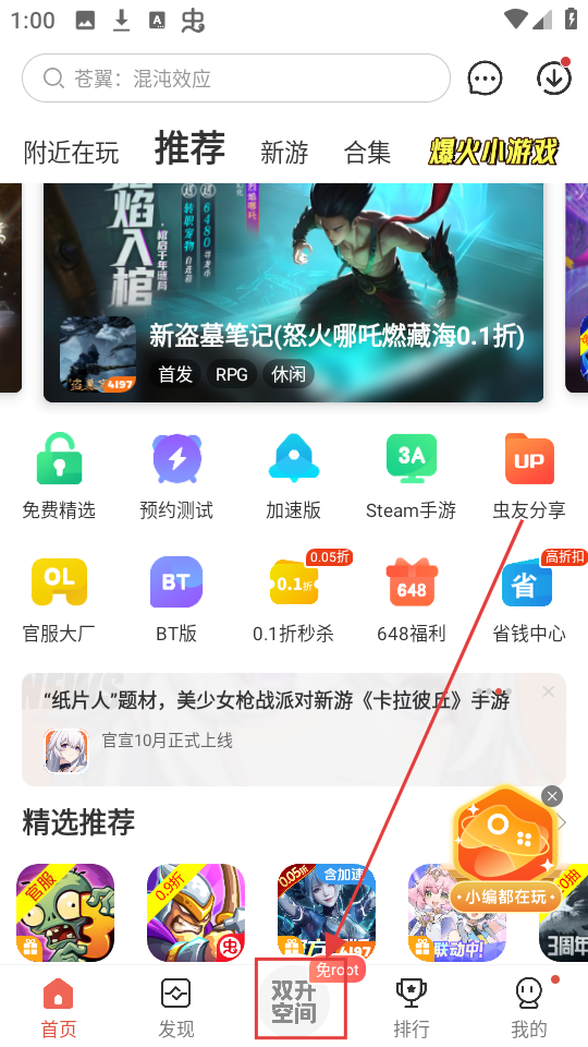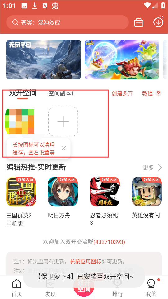 1、在软件首页,能看到底部的【双开空间】选项,点击它就能进入双开空间页面,去设置应用双开啦,很方便呢。