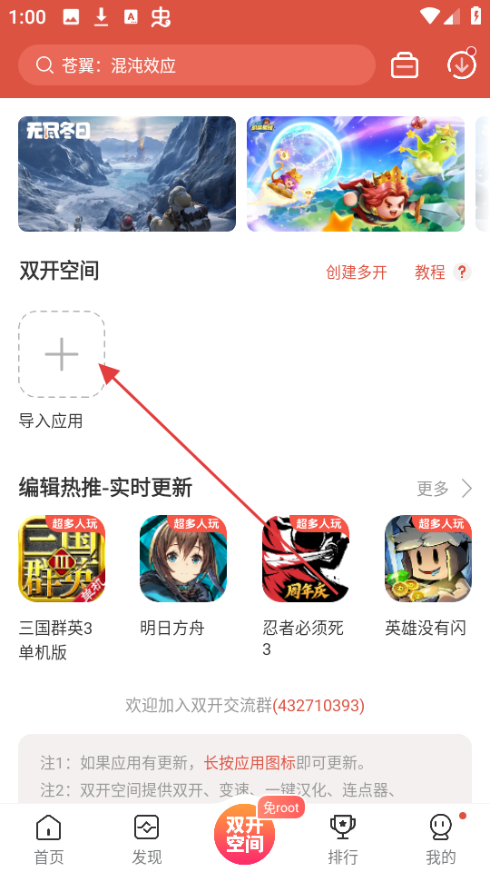 2、进入双开空间页面后,看到【导入应用】的加号按钮,点击它就能进入已装应用选择界面,挑选要双开的应用啦。
