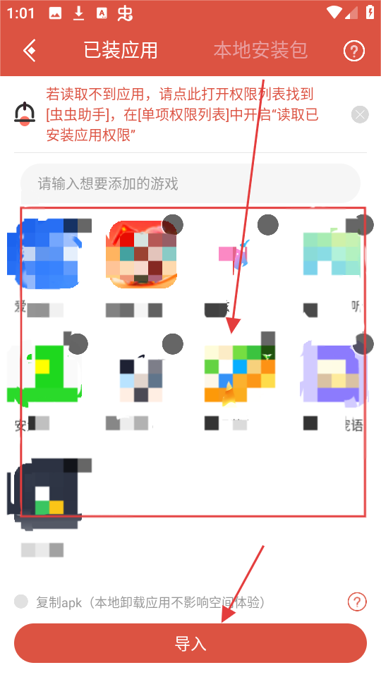 3、进入已装应用选择界面,选好要双开的应用后,点击【导入】按钮,就能把应用导入到双开空间,实现双开啦。