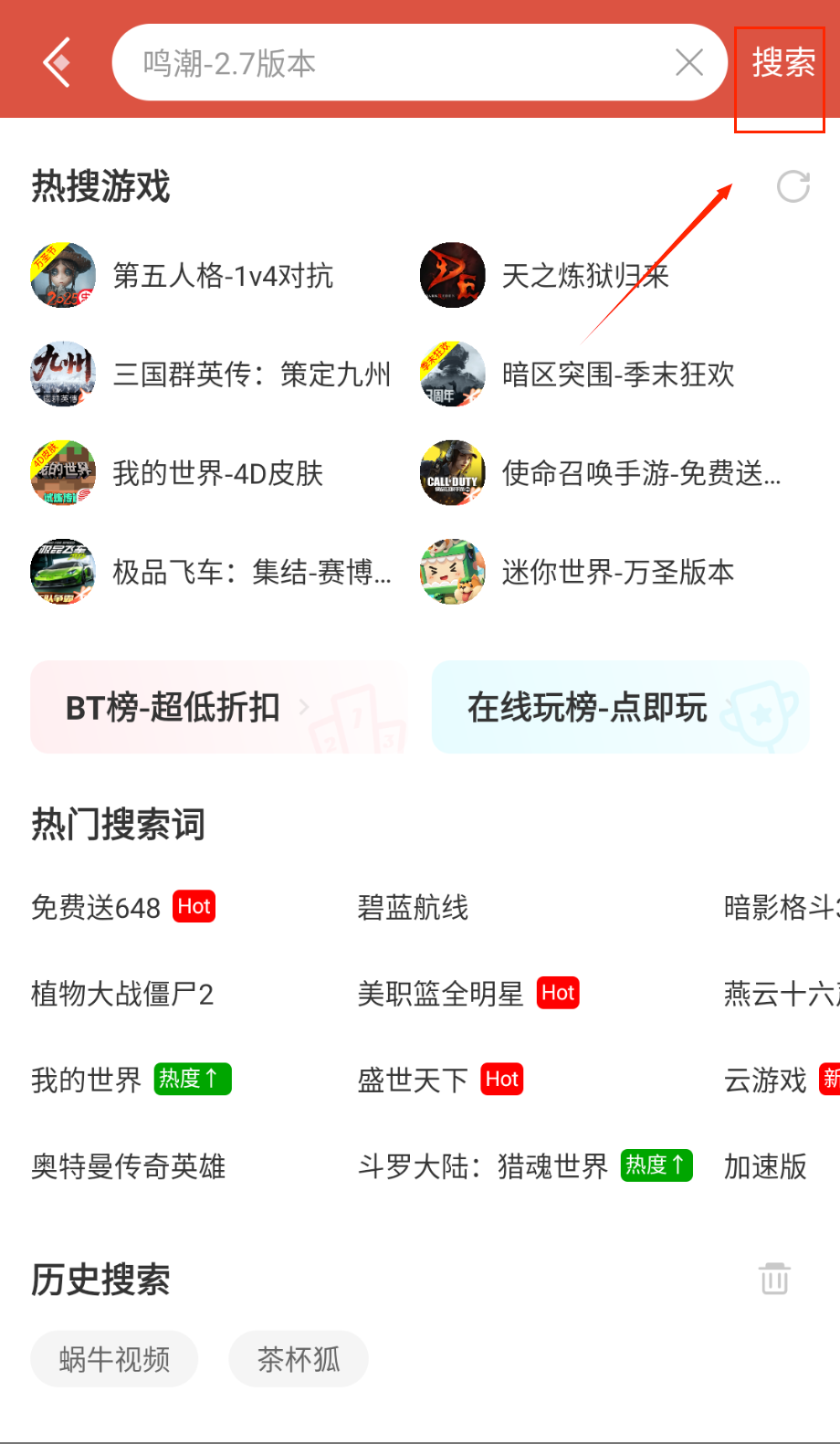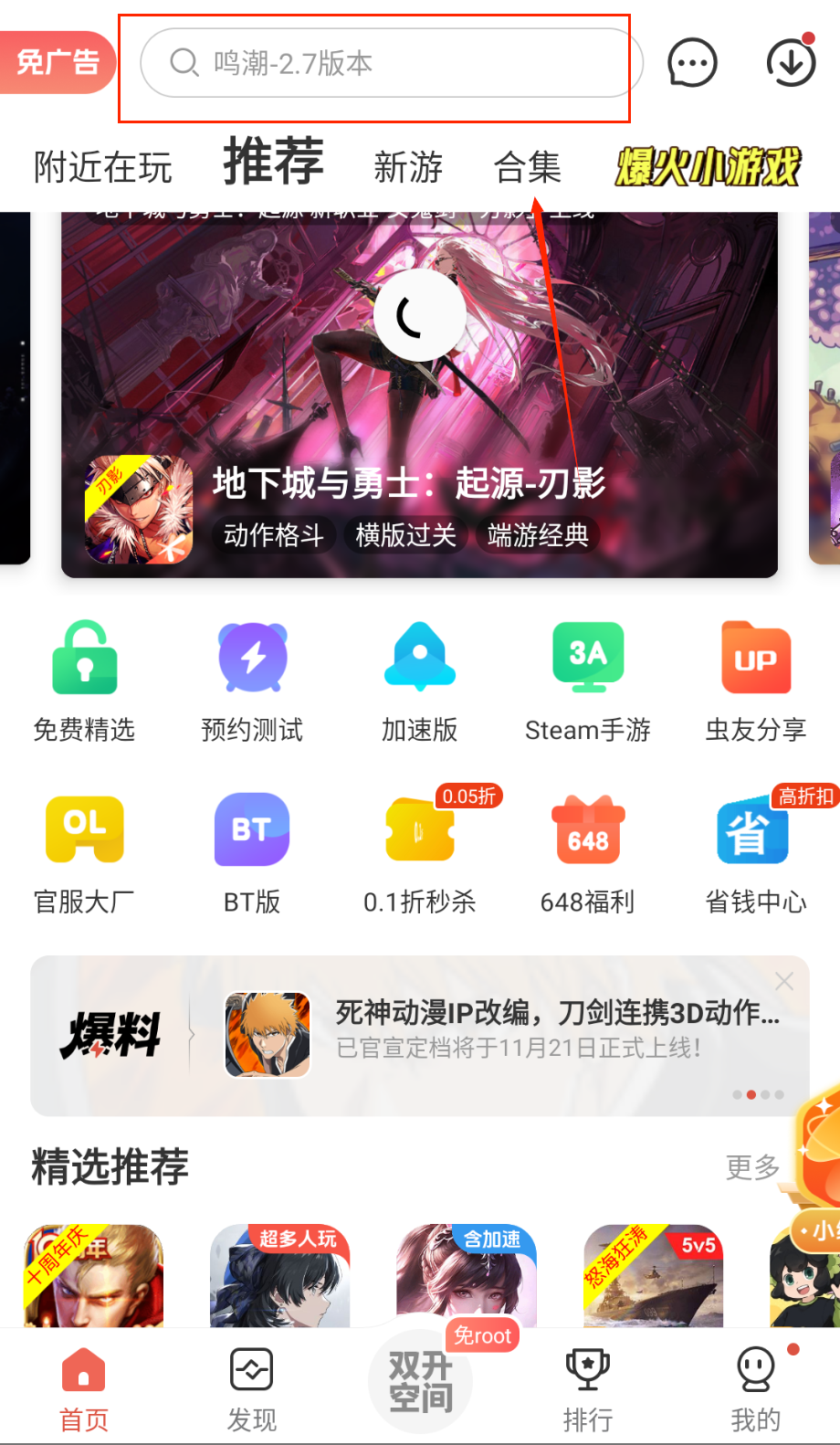1、打开软件后首先关注顶部的搜索框,这里可以输入游戏名称或关键词进行精准查找,比如输入"鸣潮"就能直接找到相关游戏。