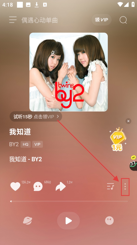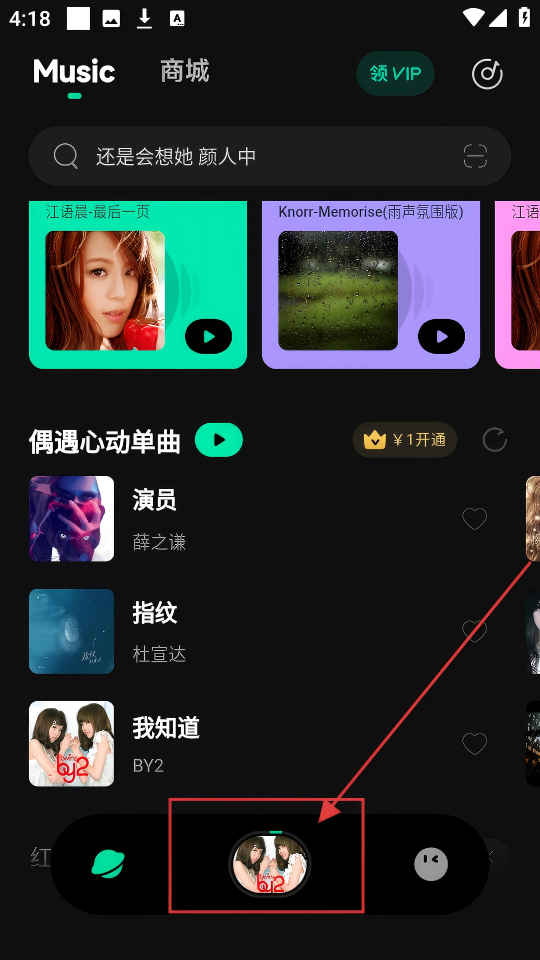 1、在音乐页面,看到底部播放栏里BY2的歌曲,点击它就能进入播放页面,去听听吧。