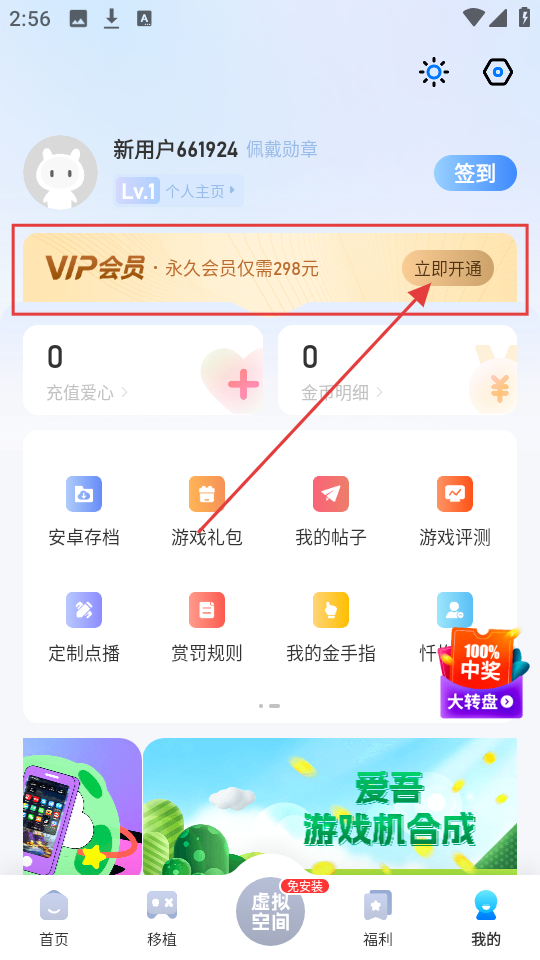 2、进入个人页面后,点【VIP会员·永久会员仅需298元】的【立即开通】按钮呀,就能进入会员开通页面啦。