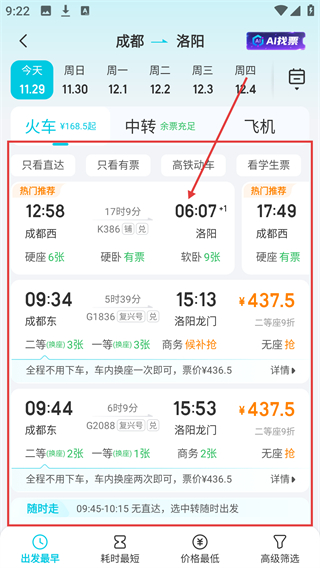 1、在APP的车次列表页,选定目标车次(如K386),点击对应区域进入该车次的购票详情界面啦。