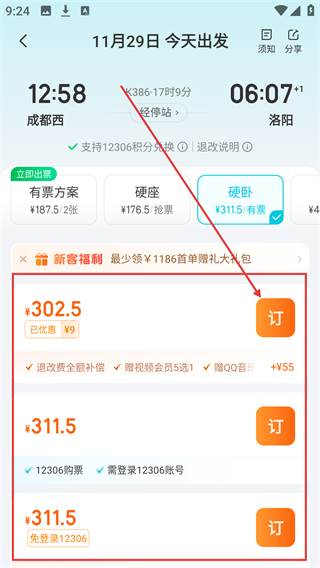 2、进入车次详情页后,选择座位类型(如硬卧),再点击对应价位旁的“订”按钮,进入信息填写页面哦。