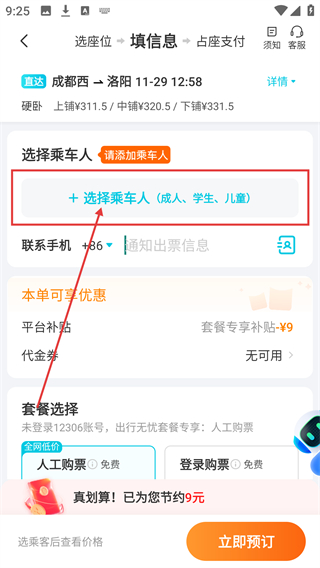 3、在信息页点击【+选择乘车人】选项,进入乘车人选择界面,可添加或选择已有的乘车人信息呀。