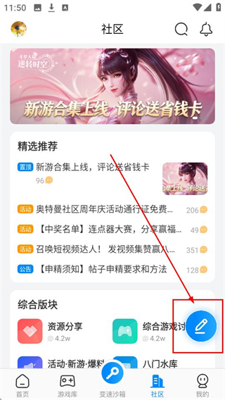 2、在社区页面点击发帖子的图标,就能进入发帖子界面,准备分享内容啦。