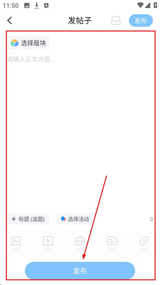3、在发帖子界面填写内容后,点击【发布】,就能分享你的游戏心得或疑问啦。