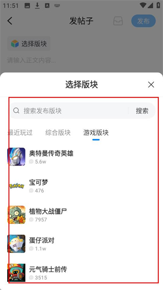 4、发布前选择游戏版块,比如【奥特曼传奇英雄】,就能将帖子发布到对应的游戏社区啦。