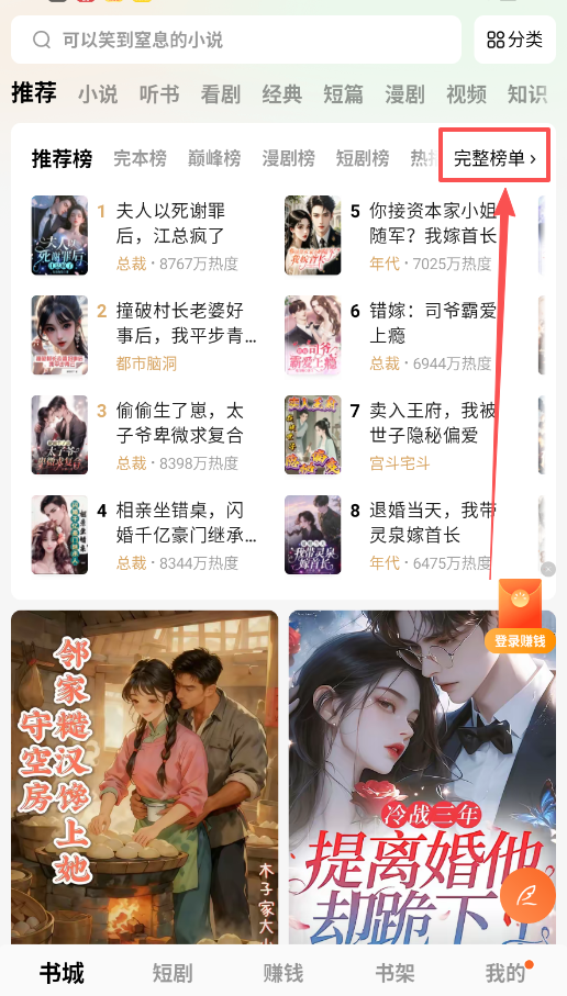 1、不知道读什么书,那就先去书城看榜单吧,“推荐榜”和“完本榜”里都是高热度作品。