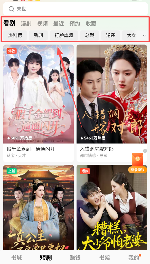 3、觉得只看小说单调,软件还有短剧专区,切换到“短剧”页,你会发现“女将军穿成受气包”这类爆款剧集。