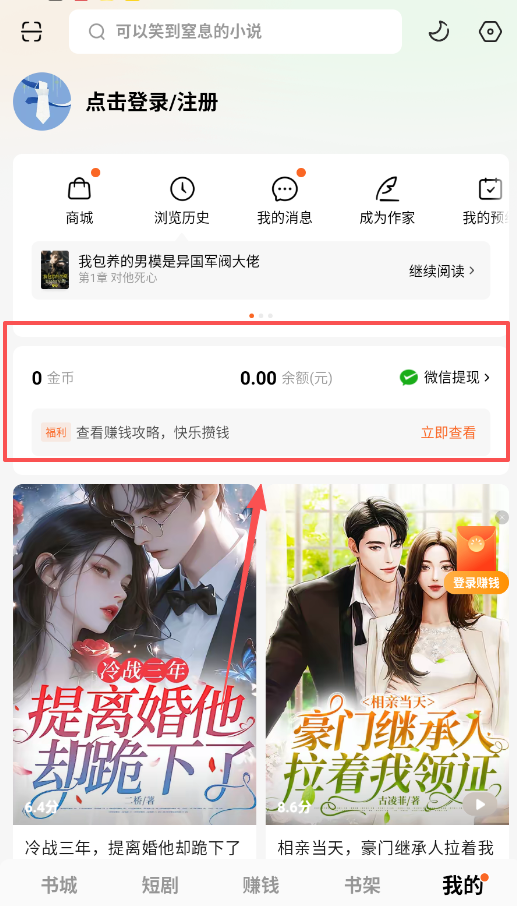 4、想看看有没有福利,完成登录后,记得在“我的”页面查看“金币余额”和“赚钱攻略”,了解软件提供的额外激励玩法。