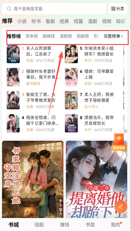 2、第二步探索海量书库与榜单,进入“书城”页面,通过顶部的分类频道如“推荐、小说、听书”筛选类型。
