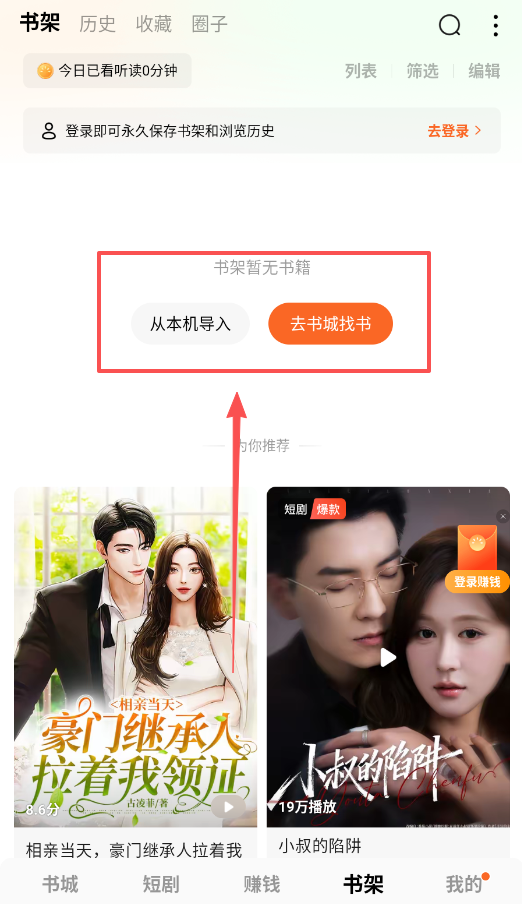 3、第三步有效管理个人阅读进度,点击底部导航栏的“书架”,登录后此处会保存你所有添加的书籍。