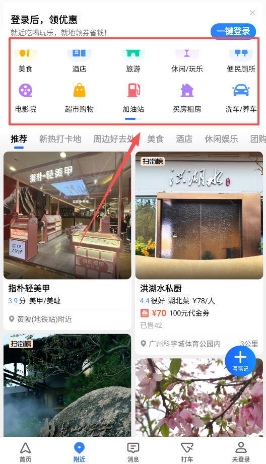 4、留意附近页面里的推荐板块,那里常有新热打卡地和商家优惠券,能省下不少钱呢。