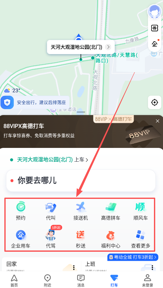 3、需要打车时,在主界面或打车页输入起点与终点,高德会同时展示实时打车、拼车、顺风车等多种选项。