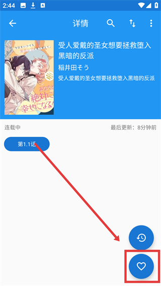 2、进入动漫详情页后,找到右侧的爱心形状【收藏】按钮,点击即可触发收藏操作哦。