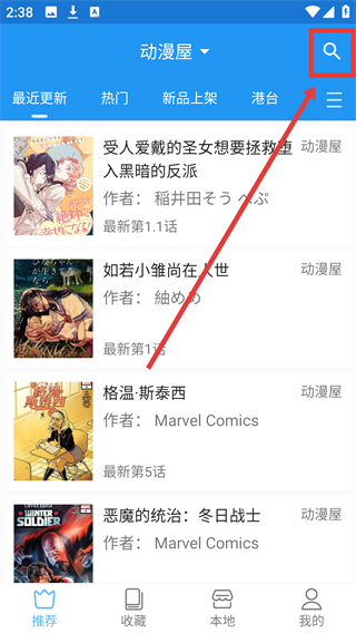 1、在推荐页,点顶部的搜索图标,可进入搜索界面,查找特定的漫画内容哦。