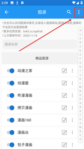 2、进入图源页面后,点击右上角的三点菜单按钮,可展开功能选项列表,找到导入图源的相关功能哦。