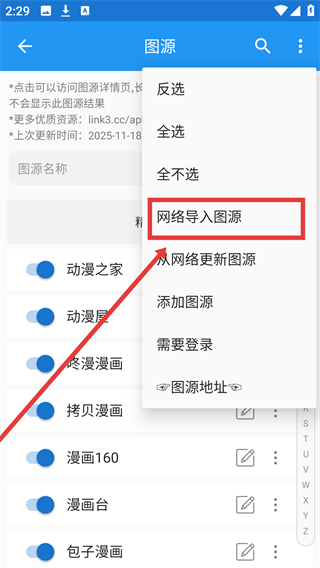 3、在展开的菜单中,选择【网络导入图源】,即可弹出图源地址的输入窗口,准备添加新图源啦。