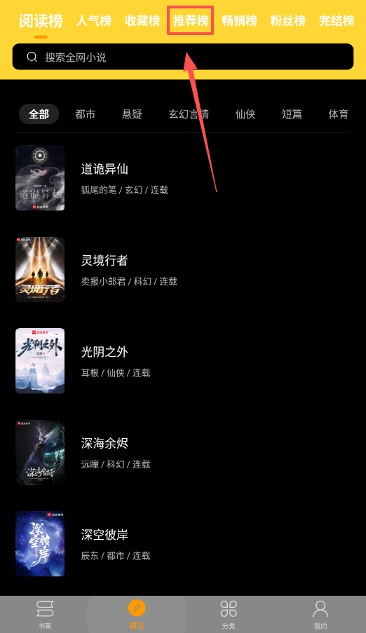 1、当你打开App想找热门书时,直接看首页的推荐榜、畅销榜就行了,榜单上的灵境行者、深海余烬都是当前很火的作品。