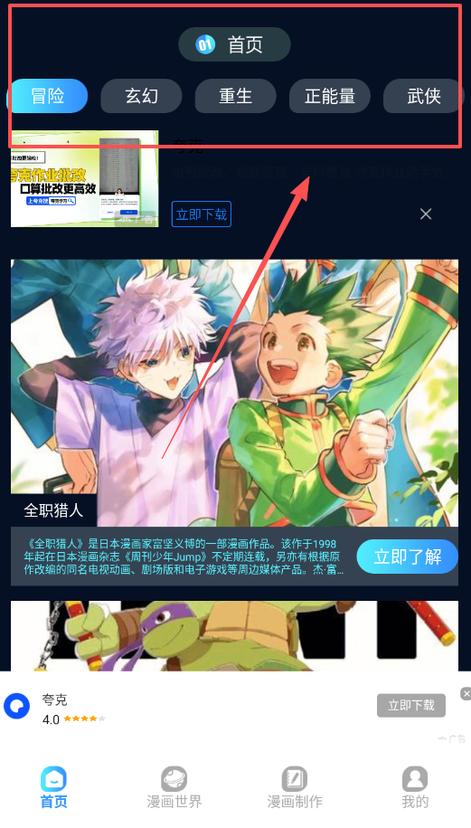 1、浏览从首页开始,利用冒险、正能量等分类筛选内容,阅读像全职猎人这样的作品简介,帮助你快速找到想看的书。