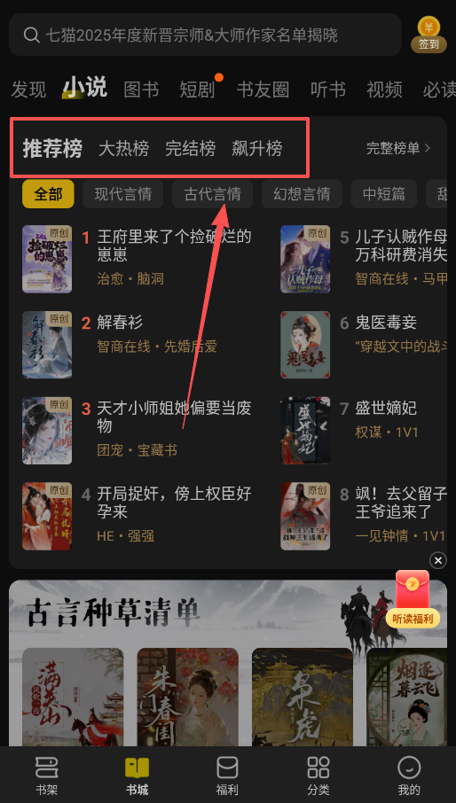 1、找书时,先进入“书城”页,顶部有“推荐榜、大热榜、完结榜、飙升榜”等多种榜单,你可以直接浏览这些榜单来快速挑选。