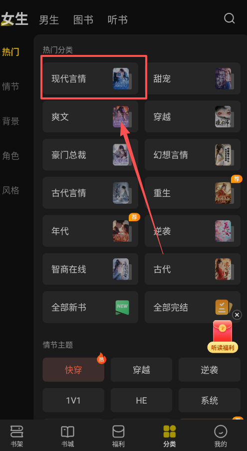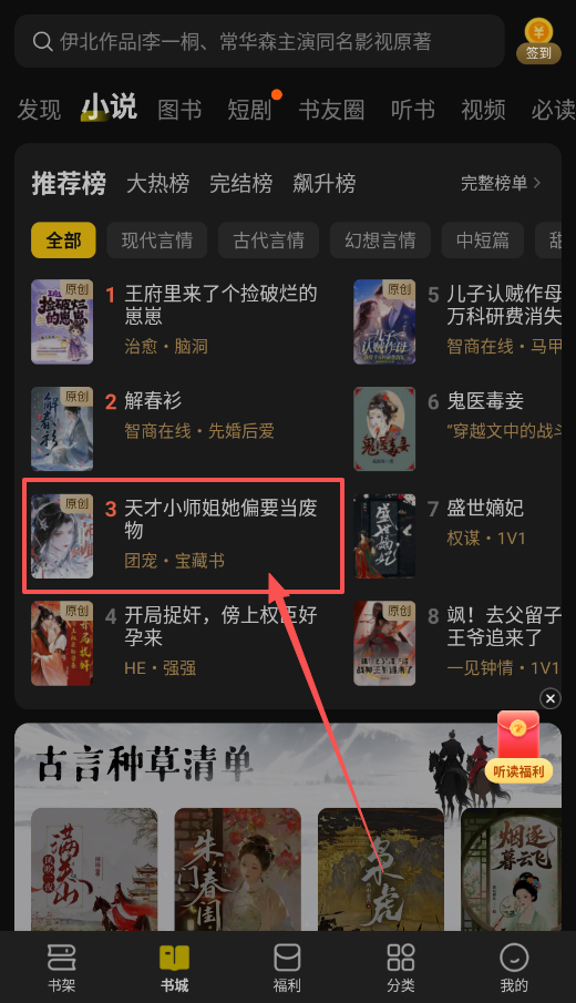2、利用细致的分类来缩小范围,在书城页面可以看到“全部、现代言情、古代言情、幻想言情、中短篇”等大分类。
