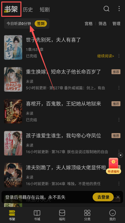 4、日常维护你的书架,在书架页面,未读新章节会有“未读”红点提示,已完结的作品则可以放心地一次性加入阅读计划。