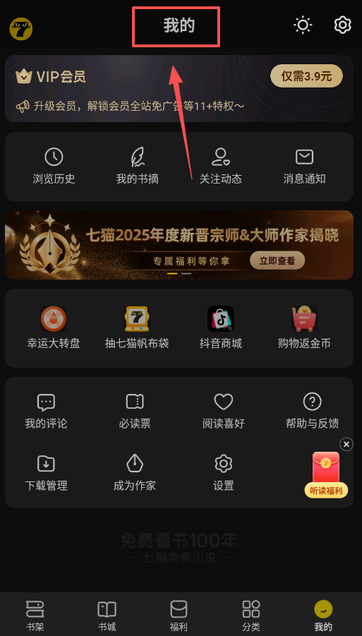 1、打开软件后,底部导航栏有“书架、书城、福利、分类、我的”五个主要入口直接点击感兴趣的标签就能浏览对应书单。