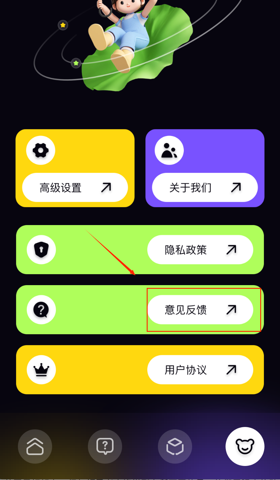 1、打开软件后首先进入个人中心页面,上方有可爱的卡通形象撑着绿伞坐在绿叶上,页面下方有几个功能按钮。