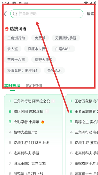 2、进入搜索页后,可看到热搜词语和实时热搜列表,直接选热门游戏名也能快速搜索哦。