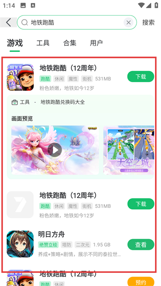 3、搜索结果页会展示对应游戏(如【地铁跑酷-(12周年)】),还能看到游戏标签和大小信息呢。