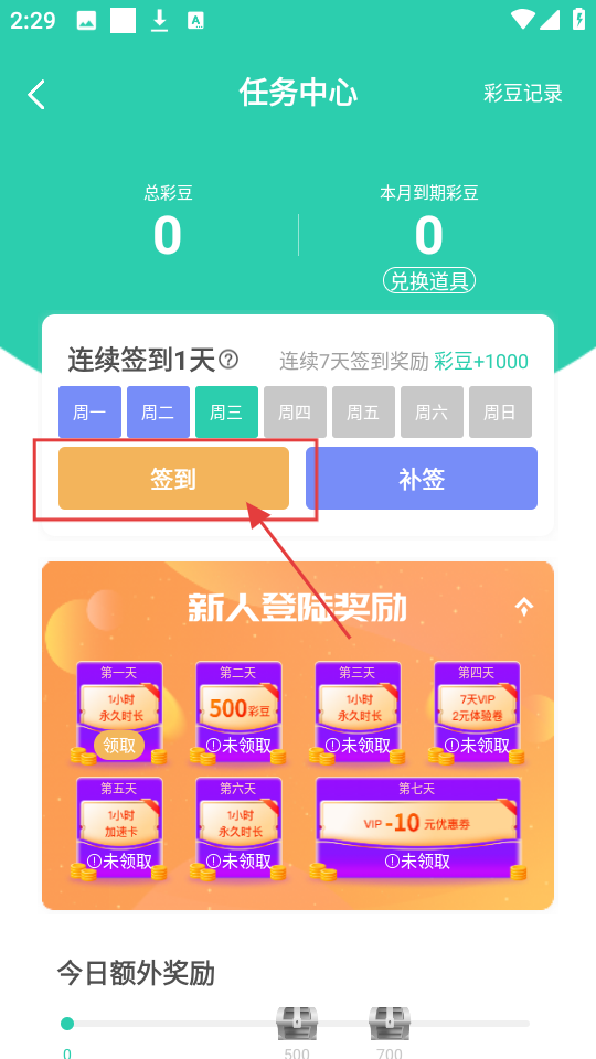 3、进入【任务中心】后,点【签到】按钮,就能领签到奖励啦,别错过哦。