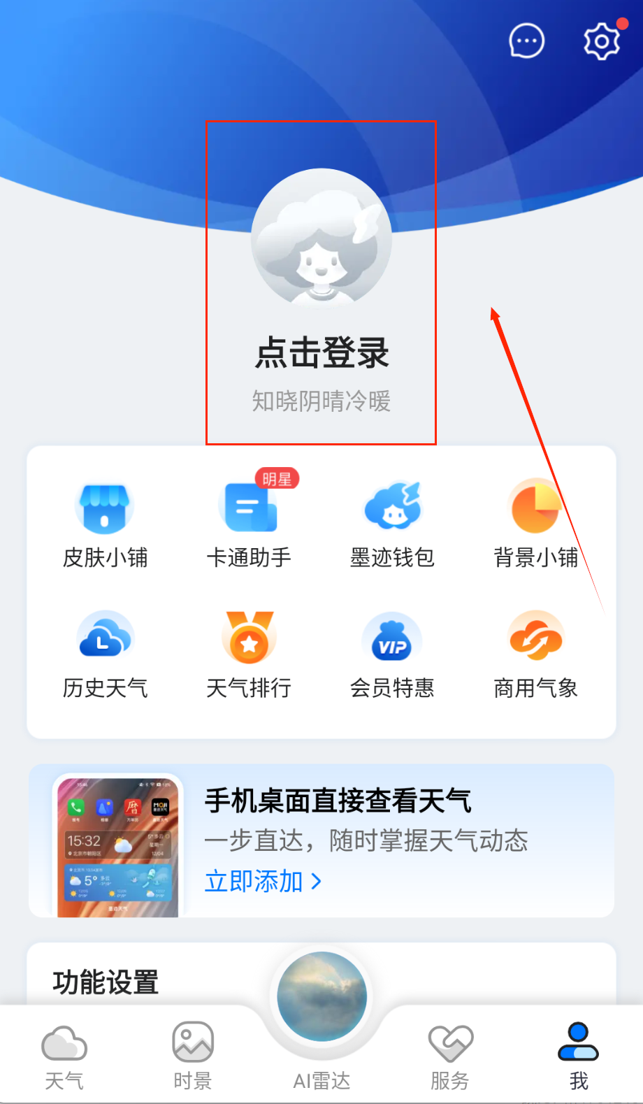 1、首次使用建议先完成账号登录,这样能解锁更多功能,登录后系统会自动定位当前城市,显示实时天气数据和未来几天的天气预报。