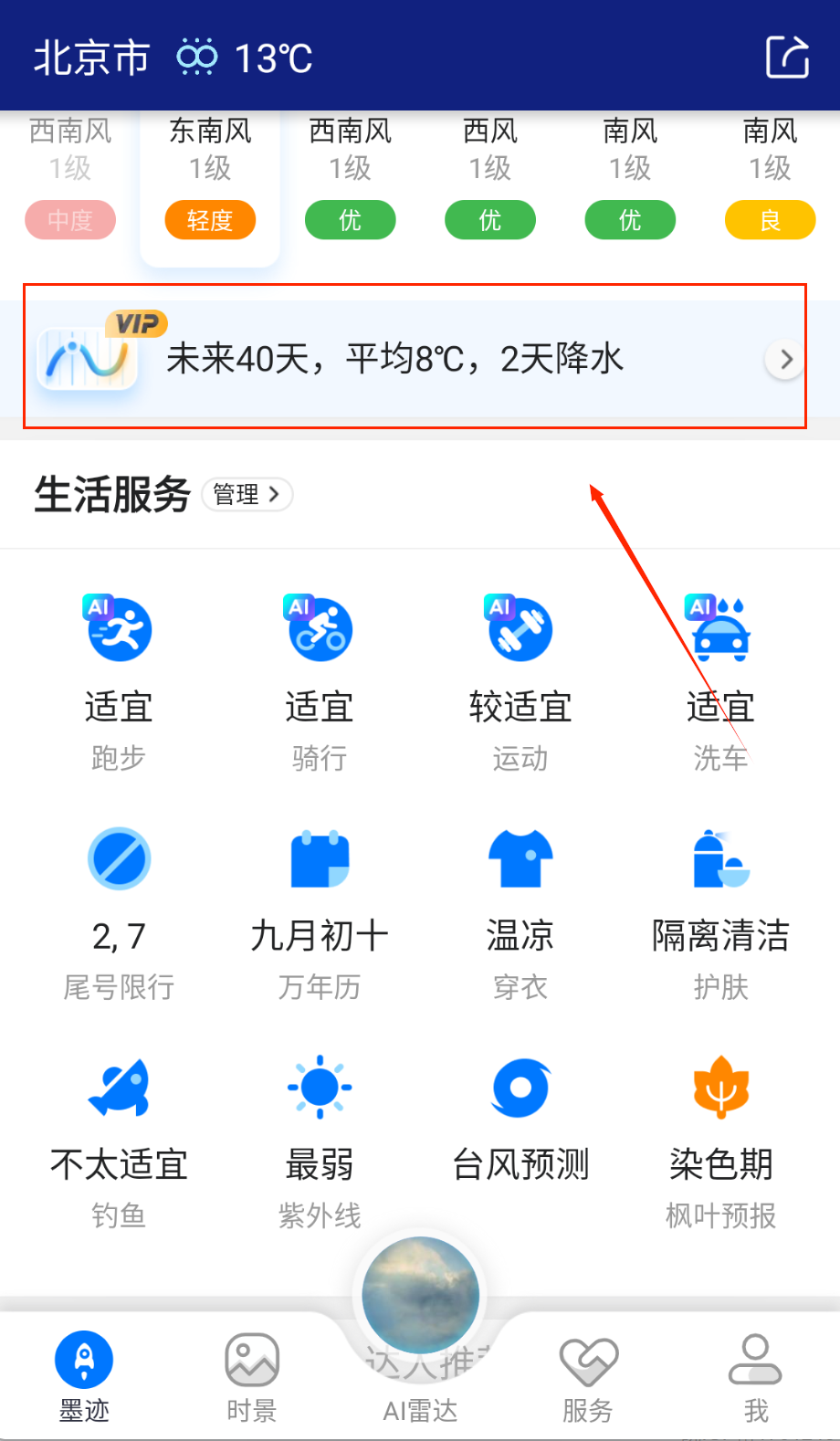 1、在首页显眼位置可以看到"墨迹天气尊享VIP"的推广入口,点击了解超过44项会员专属权益,包括精准的180天长期天气预报。