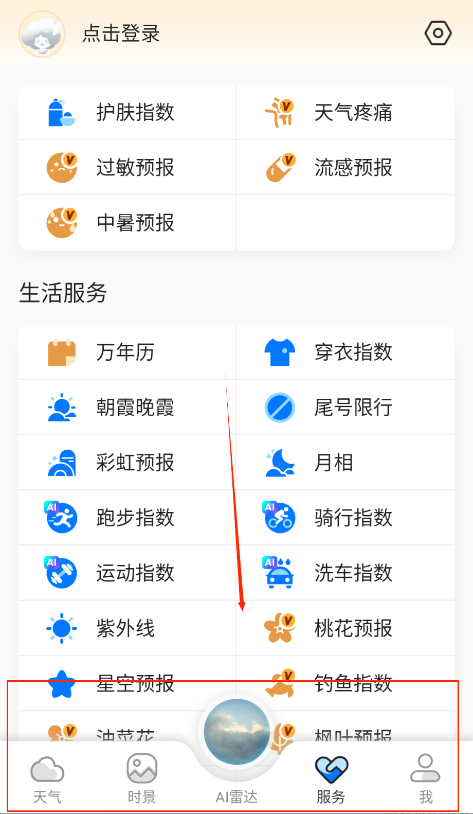 4、底部导航栏的五个功能模块各具特色,可以在"天气""时景""AI雷达"等页面间切换,获取不同维度的天气信息,满足各种使用需求。