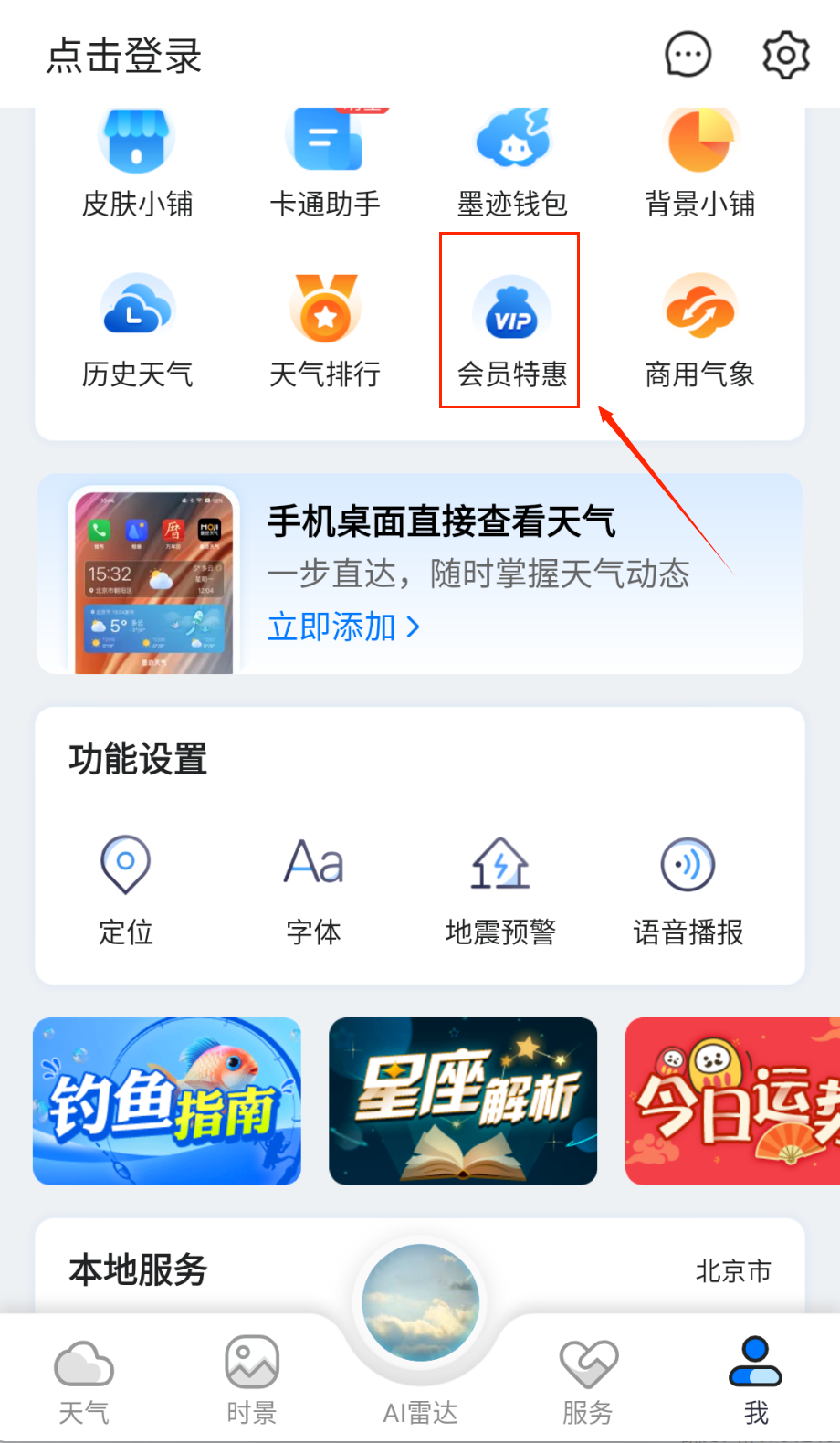 1、打开墨迹天气APP后首先点击界面中央的"点击登录"按钮完成账号注册或登录流程,登录后可以享受个性化天气服务。