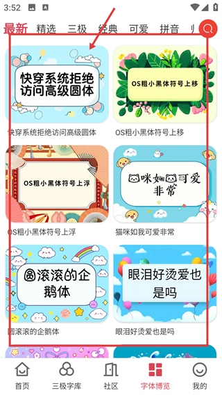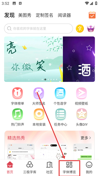 1、在首页点击底部的【字体博览】选项,就能进入字体博览页面,浏览各类特色字体啦。