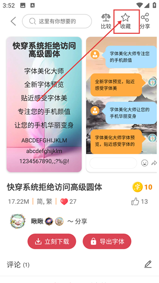 3、在字体详情页,点击右上角的【收藏】按钮,就能把这款字体加入收藏夹,不过可能需要登录哦。