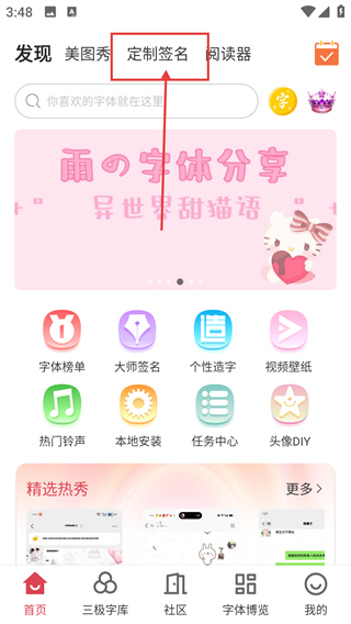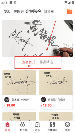 1、在APP的首页,点击顶部的【定制签名】标签,可进入签名定制页面,挑选各类签名样式啦。