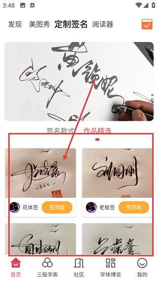 3、切换到【作品精选】标签,选择心仪的签名样式,点击下方的【签同款】按钮,即可进入该签名的定制界面啦。