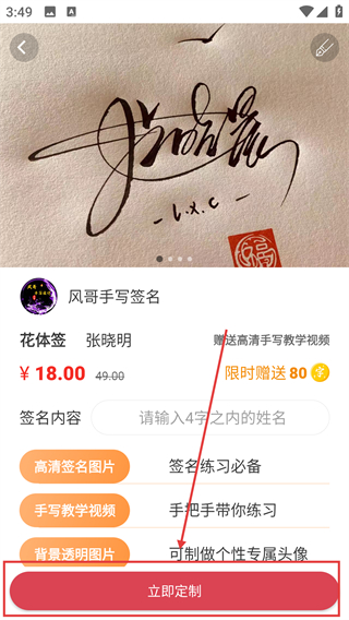 4、在签名定制界面,输入姓名后点击【立即定制】,即可生成专属签名,还能获取高清图片等配套资源呀。