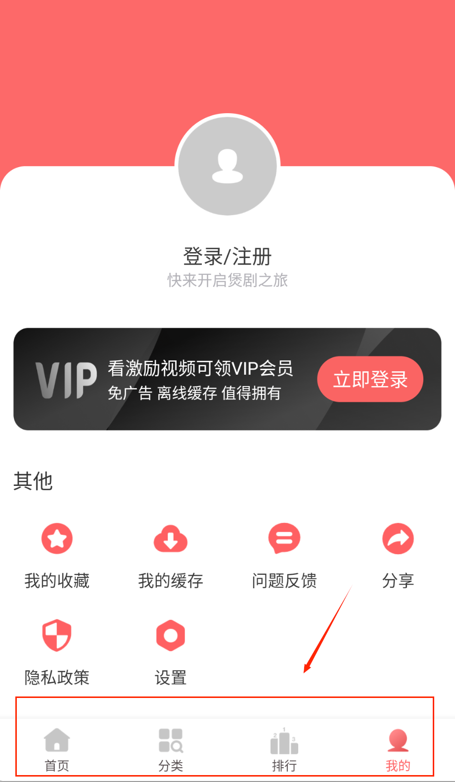 2、利用底部导航栏的四个主要模块开展观影之旅,首页提供推荐内容,分类支持精细筛选,排行展示热门趋势,我的页面管理个人数据。